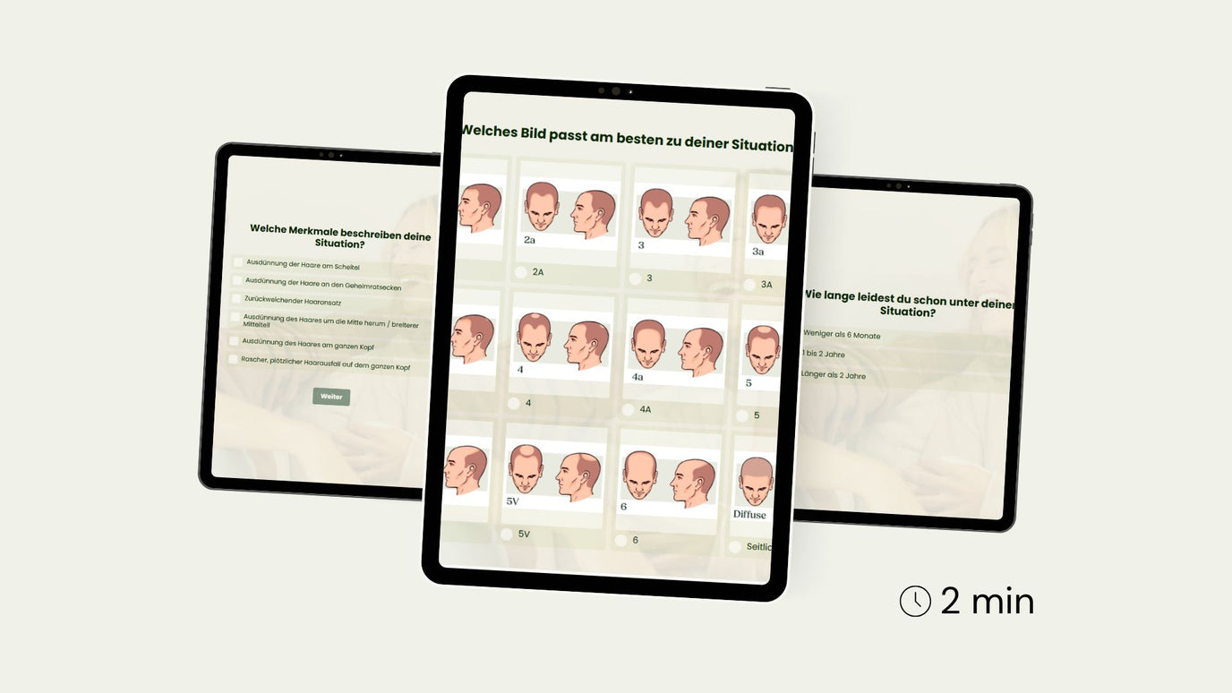 Durch das Beantworten weniger Fragen erhältst du sofort eine persönliche, kostenlose und unverbindliche Empfehlung, die perfekt auf deine Haarbedürfnisse abgestimmt ist.